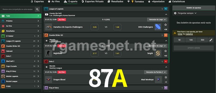O 87A oferece uma grande seleção de opções de apostas em e-sports com probabilidades competitivas